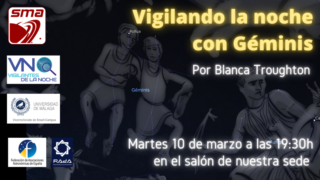 El próximo martes 10 de marzo a las 19:30 horas, podréis asistir, en el salón de nuestra sede, a la charla «Vigilando la noche con Géminis», a cargo de Blanca Troughton. Contaremos estrellas con Vigilantes de la Noche en esta zona para medir el impacto de la contaminación lumínica y aprenderemos algo más de esta antigua constelación que tiene mucho que desvelarnos. Colabora el Vicerrectorado de Smart-Campus de … Leer más